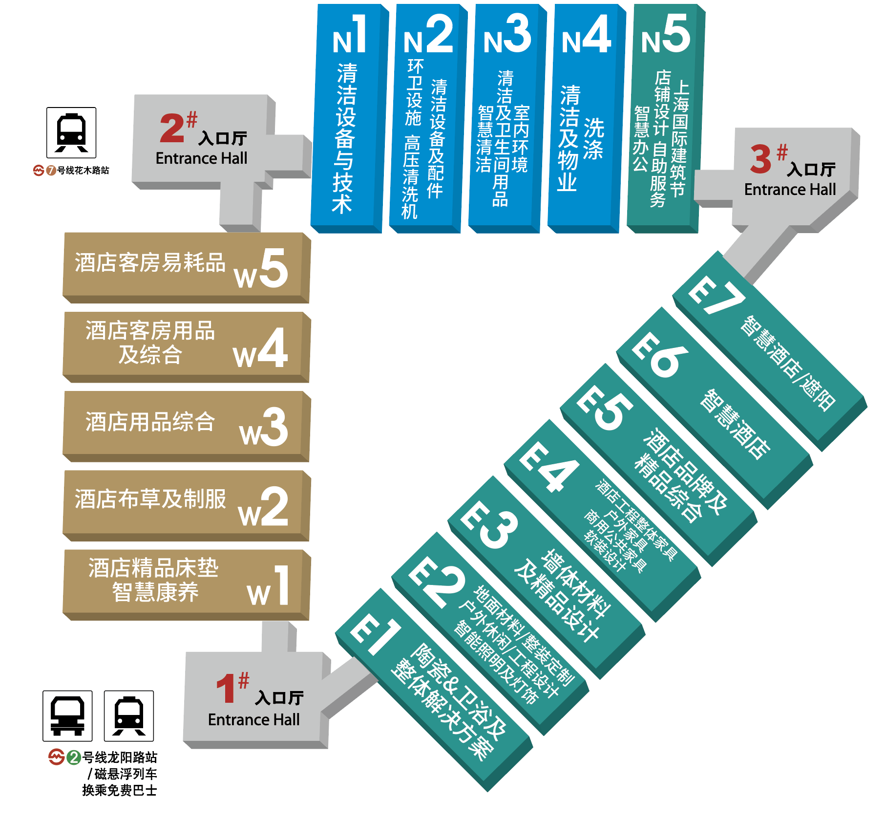 E系列馆(硬装科技): 集中展示建筑装饰材料、卫浴洁具、工程设计及整装定制、照明及智能客控(含智慧酒店解决方案)等。